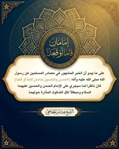 البوسترات يبدو أن : (الحسن والحسين إمامان قاما أو قعدا) كان ناظرا لما سيجري على الإمام الحسن.. 0 18 شارك FacebookTwitterWhatsAppPinterestالبريد الإلكترونيTelegram
